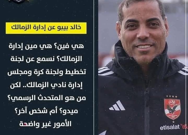 بدون مقدمات تفاجأت ببوست على مواقع التواصل الاجتماعي يخص الكابتن خالد بيبو لاعب الأهلي السابق يطرح اسأله خاصة بنادي الزمالك وكان خالد بيبو عايش في كوكب أخر ولا يعلم الإجابات عن أسألته التي لن تقدم أو تأخر بالنسبة له خصوصا انه محسوب على نادي منافس فمن الطبيعي أن يهتم بشئون ناديه.